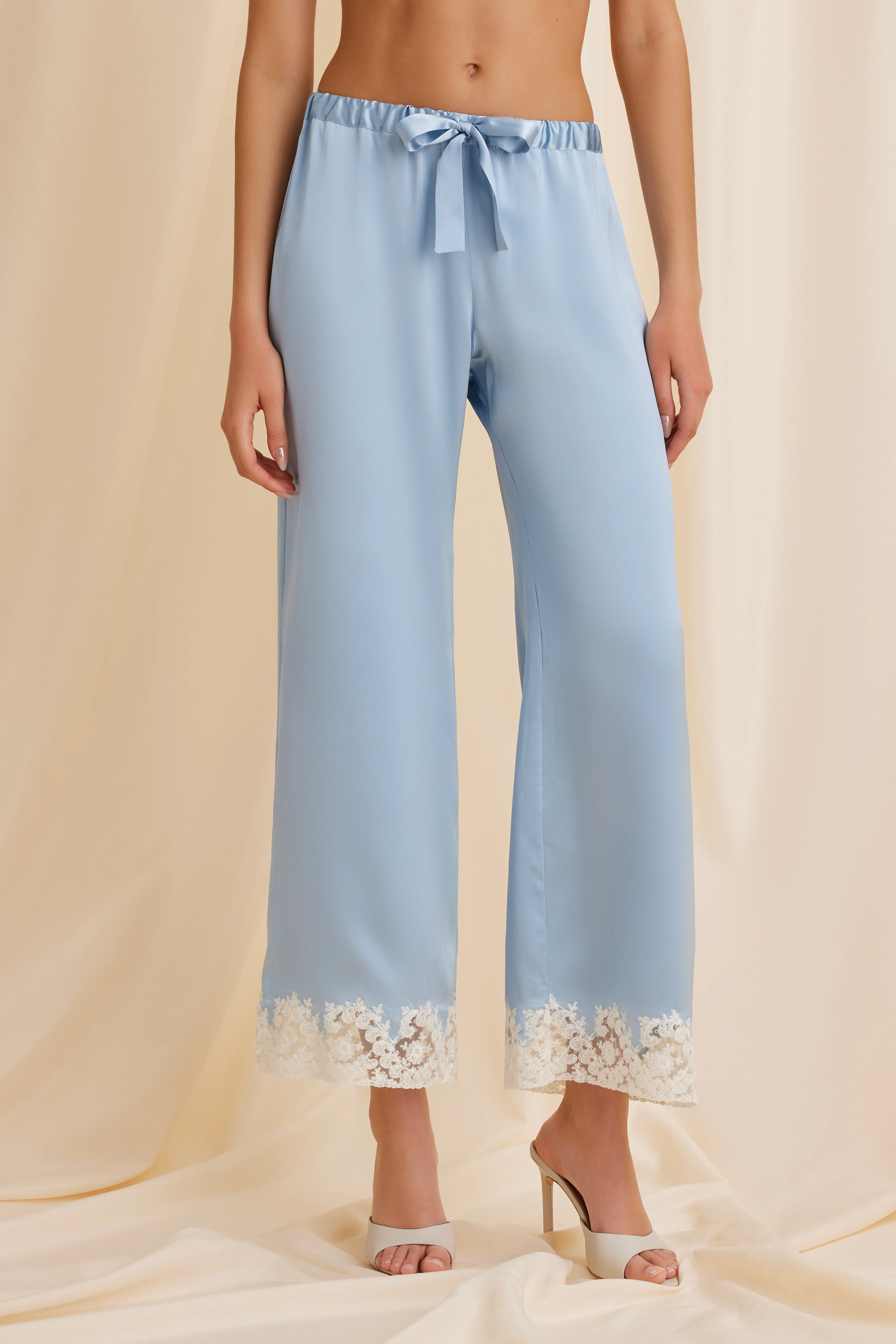 Cut to skim the body with a relaxed, elongated line, the trousers are crafted from 100% silk that softly caresses the skin while maintaining a refined drape. Delicately hand-sewn French lace appliqué is individually cut from a single large piece of lace to preserve the integrity of the pattern, then precisely positioned and hand-applied to each garment. This meticulous process creates seamless integration and a level of detail that cannot be achieved through standard production.