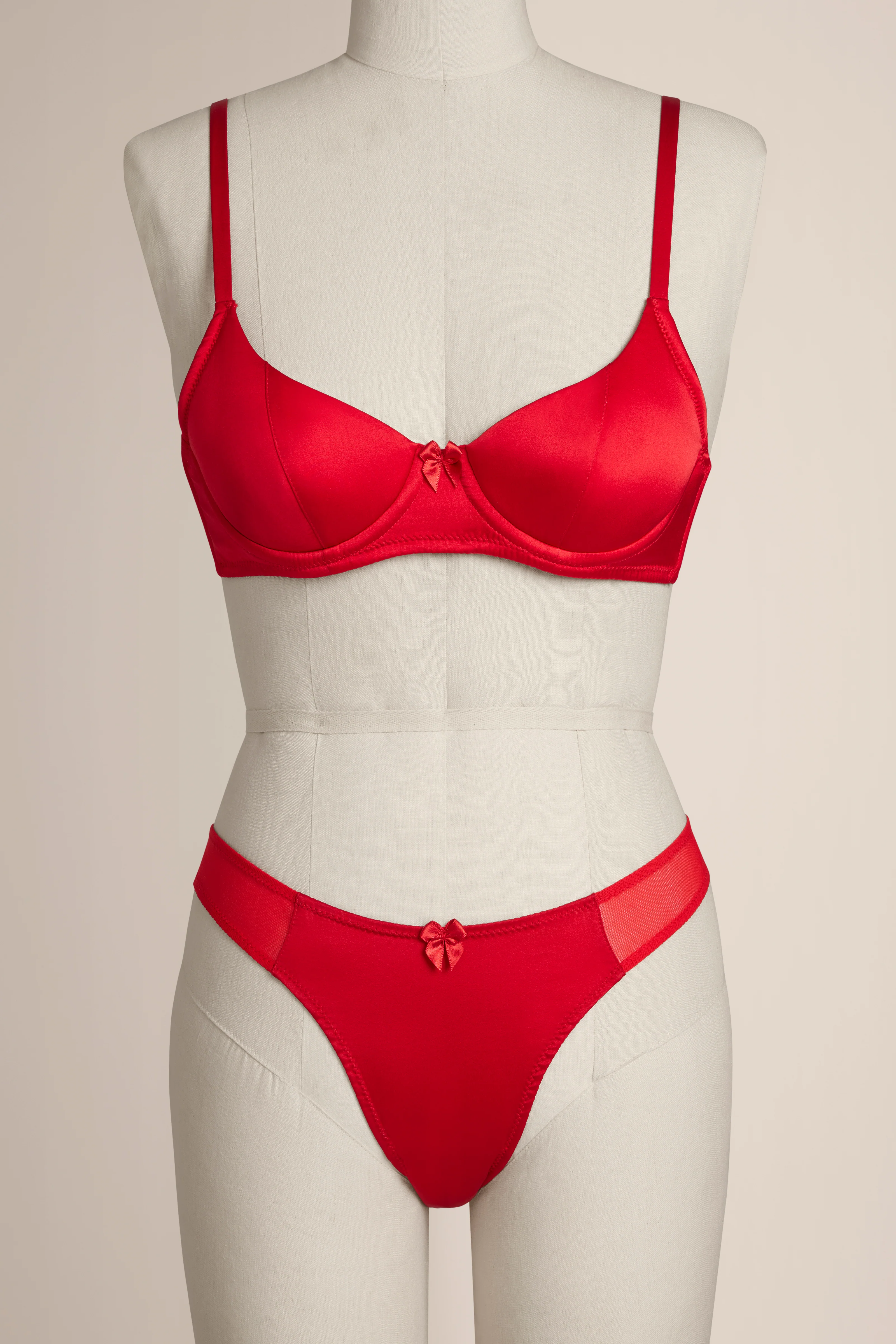 Crafted from stretch silk charmeuse, the demi cups create a defined, contemporary silhouette while contouring naturally to the body. The silk glides coolly against the skin with a subtle natural lustre, balancing softness with structure. A delicate silk bow adornment sits between the cups, adding a refined focal detail.
